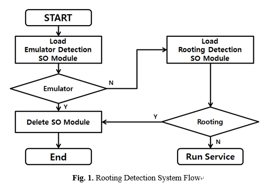 NDK를 통해 구현된 라이브러리인 SO(Shared Object)를 사용한 게임사 또는 금융권의 앱에서 루팅 탐지 프로세스가 실행되면, 첫 번째로 에뮬레이터 환경 탐지 모듈이 로드되어 동작한다. SO 파일의 경우 암호화되어 APK 내부에 존재하다가 실행 시 복호화되어 동작하거나, 금융권 및 게임사 서버에서 런타임에 다운로드 받아 실행시킬 수 있다.