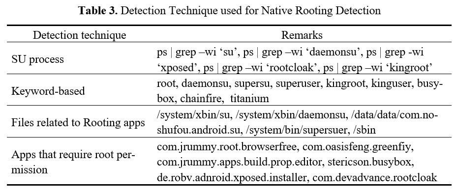 루팅 탐지 모듈에서는 아래의 표 3과 같이 SU 관련 프로세스의 실행 여부 및 다양한 파일 및 디렉토리에서의 키워드 기반 탐지, 원터치 루팅 앱 관련 파일 탐지, 루트 권한이 필요한 앱을 탐지하는 방법 등을 사용한다.