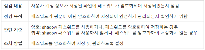 이를 파이프로 넘겨서 "wc -l" 명령어로 해당 라인 수를 출력했을 때 0이 나온다면 shadow 패스워드를 사용한 것으로 볼 수 있고, 해당 항목은 양호하다고 판단할 수 있는 겁니다. 만약 결과가 1 이상이 나온다면 일반 패스워드 정책을 따르고 있기 때문에 취약하므로 pwconv 명령어를 이용해서 shadow 패스워드 정책을 따르도록 조치를 취해주면 됩니다.