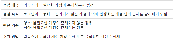 여기서 말하는 불필요한 계정은 위에서 말씀드린 리눅스를 설치할 때 기본적으로 생성되지만 사용하지 않는 디폴트 계정을 포함하여, 관리자가 특정 사용자에게 계정을 할당해서 접속할 수 있도록 했으나 퇴직 또는 휴직 등의 이유로 장기적으로 사용되지 않는 계정들도 포함합니다.
