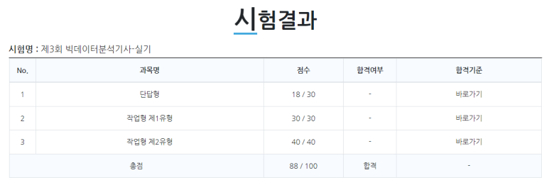 시험 결과는 일단 예상한 대로 작업형 1유형과 2유형은 모두 만점을 받았으며, 단답형에서 점수를 꽤 깎아먹었다. 사실 작업형보다도 단답형이 더 어려웠다고 느꼈는데, 지문을 주고 답을 적는 형태가 아니라 어떤 개념에 대한 설명 중간에 괄호를 채우는 문제였기 때문인 것 같다. 그리고 조금 걱정했던 작업형 1유형에서는 중간 과정 없이 변수에 답을 저장하고 print문으로 출력만 해도 점수를 주기 때문에, 자세한 풀이를 하지 못하더라도 어느 정도 편법을 이용해서 문제를 풀 수 있을 것으로 생각된다.