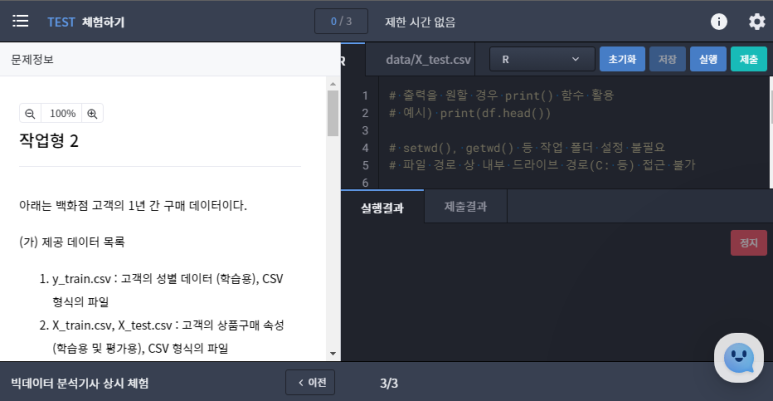 시험 환경은 구름이라는 클라우드 기반의 코딩 테스트 플랫폼에서 진행됬으며, 자격검정 홈페이지에 올라온 "응시환경 체험하기"와 거의 동일하다고 보면 된다. 나는 시험을 준비할 때 어느 정도 코드에 익숙해지기 전까지는 RStudio를 이용하여 공부했지만, 시험을 보는 환경에서는 함수 자동완성이나 에러 메시지도 어디서 틀렸는지 표시되지 않기 때문에 구름 플랫폼에서도 동일하게 코드를 입력할 수 있도록 연습하였다. 다만 가끔 서버에 트래픽이 몰리면 제대로 된 코드임에도 불구하고 에러가 발생할 때가 있는 것 같으니, 맞는데 왜 틀리지 싶으면 다시 한 번 실행해 볼 필요는 있을 것 같다.