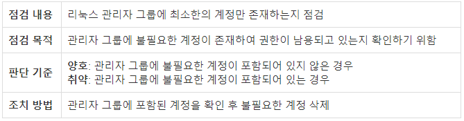 여기까지 리눅스 명령어를 통해 관리자 그룹에 최소한의 계정이 존재하는지 점검하는 방법에 대해 알아봤습니다. 사실 진단 스크립트를 구성하고 나온 결과를 가지고 보고서를 작성하는 방법은 굉장히 다양하기 때문에 꼭 위와 같이 할 필요는 없습니다.