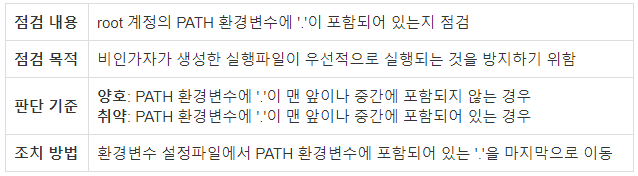 이번 항목부터는 설정 파일의 권한이나 소유자가 잘 설정되어 있는지 확인하는 내용들이 많은데요. 이번 글에서 설명드릴 내용은 "root 홈, 패스 디렉터리 권한 및 패스 설정"으로 비인가자가 환경 변수 조작을 통해서 악의적인 기능을 실행시키지 못하도록 점검하는 항목입니다.