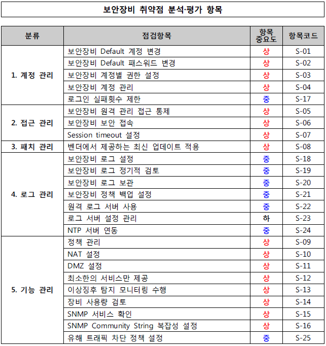 정보보호시스템을 운영하면서, 기본 디폴트 계정이나 패스워드를 변경해서 사용하고 있는지, 원격 접근은 IP로 접근 통제가 되어 있는지, 보안 장비에서 발생하는 정책이나 보안 로그 등은 제대로 관리되고 있지를 확인하고 있죠. 아래의 취약점 분석 평가 항목을 보시면, 대강 어떤 부분들을 점검하는지 감이 오실거라 생각합니다.