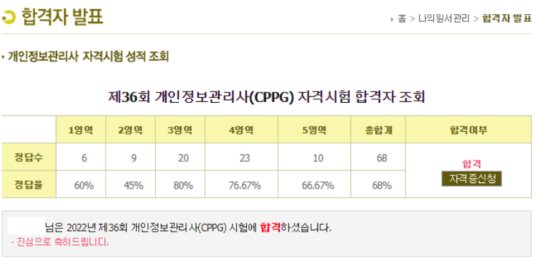 기업에서 보안 담당자로 개인정보보호 업무를 하거나 보안 컨설턴트로 일을 한다면, 대부분 가지고 있는 자격증이 CPPG인 것 같다. 나도 보안 컨설팅으로 직무를 바꾸면서 CPPG를 따야할 필요성이 생겼는데, 정보보안기사 자격증 취득 이후로 오랜만에 법에 대해 깊게 공부한 것으로 생각된다. 정보보안기사 때는 정보통신망법이 핵심이었는데 CPPG 시험은 개인정보보호법으로 시작해서 개인정보보호법으로 끝난다. 고득점은 아니지만 일단 합격 점수는 아래와 같다.