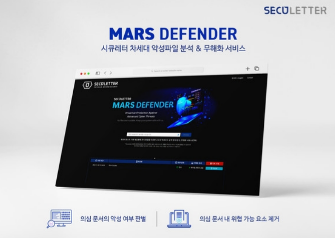 악성코드 탐지 및 차단 기업 시큐레터는 차세대 악성 파일 무료 분석 및 무해화 서비스 ‘마스 디펜더(Mars Defender)’를 출시했다고 29일 밝혔다. 마스 디펜더는 회원가입 없이 이용할 수 있는 무