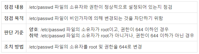 이번 항목의 점검 방법은 "ls -l" 명령어로 /etc/passwd의 자세한 정보를 출력하고, awk 명령어를 통해 공백을 기준으로 나눠진 첫 번째 필드와 세 번째 필드를 출력하도록 했습니다. 그러면 권한과 소유자가 출력되는데요. 이와 다르게 결과를 "-rw-r--r--root"로 정의된 문자열과 비교하여 양호 및 취약을 판단하거나, 권한 부분만 644와 같이 숫자로 변환하여 확인하는 등 다양하게 점검할 수 있습니다.