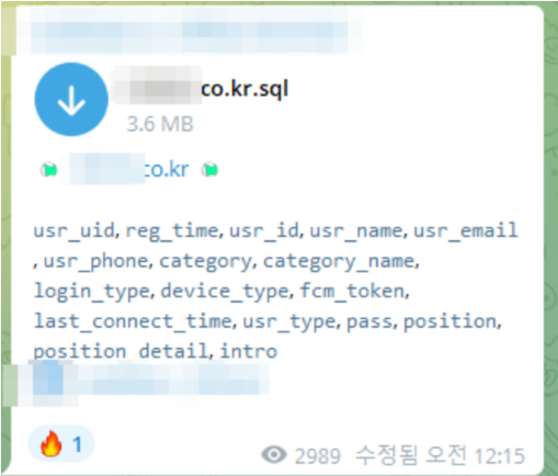 위의 이미지에서 보이는 것과 같이 유출된 DB 스키마에서는 usr_name 과usr_email, usr_phone 컬럼이 존재하는 것으로 보이는데, 회원의 이름 이메일과 핸드폰 번호는 암호화되어 있지 않기 때문에 해커들이 해당 정보들을 피싱 메일을 유포하는데 이용할 수 있을거라 봅니다.