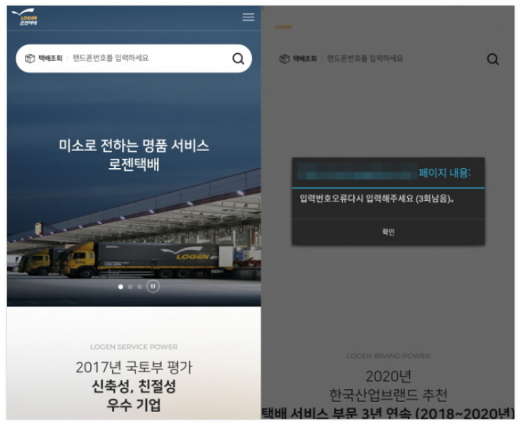 스미싱 문자를 받게 되면 "[로젠]송장번호(OOO)주소불일치로 물품보관 중입니다. http..."와 같이 배송에 실패했다면서 문자에 있는 URL을 클릭하도록 유도합니다. 해당 URL을 들어가보면 위와 같이 정상적인 홈페이지로 보이는 택배 사이트로 이동되지만, 실제 URL을 보시면 공식 사이트와 다른 것을 볼 수 있습니다.