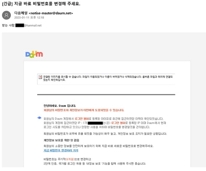 위의 피싱 메일을 보시면 제목이 "[긴급] 지금 바로 비밀번호를 변경해 주세요."로 되어있고, 보낸 사람 이메일에는 master라는 단어를 써서 관리자가 발송한 것처럼 보냈죠. 하지만 이메일 뒷부분인 도메인을 확인해보시면 daum이 아닌 daurn으로 된 것을 볼 수 있습니다.