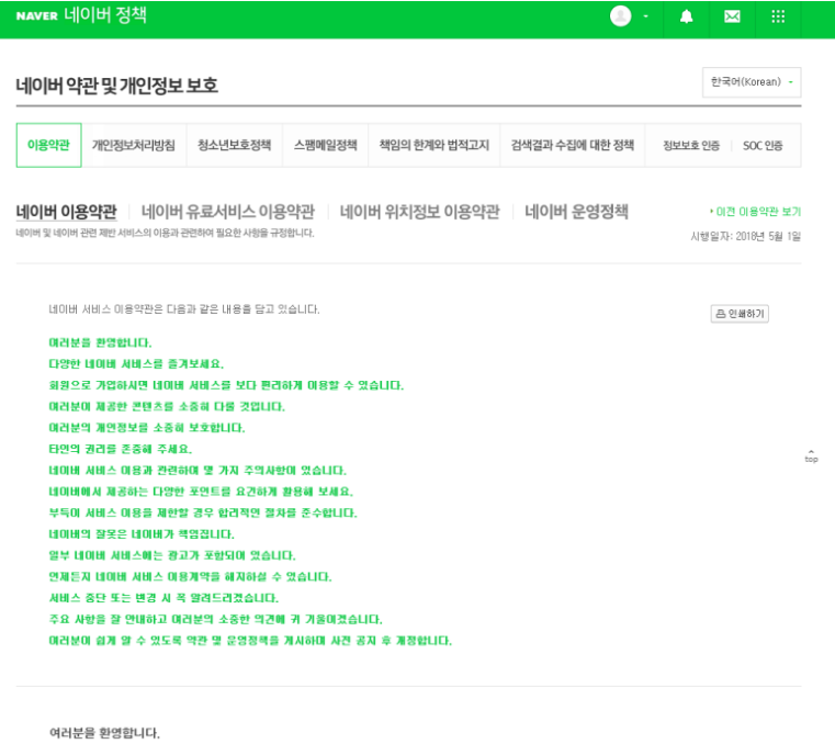 특히 아래와 같이 네이버 정책 페이지도 실제 네이버와 동일하게 구현된 것을 보니 피싱 사이트를 만드는데 엄청난 공을 들인 것으로 보인다.