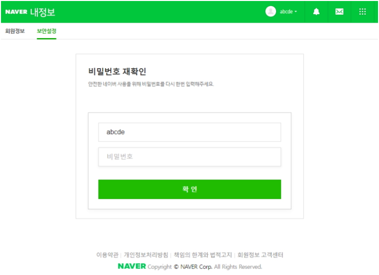 otp 파라미터를 abcde의 BASE64 인코딩하여 전달하면 아래와 같은 피싱 사이트로 이동되며, 보통의 사이트들에서 마이페이지나 보안 설정을 할 때 비밀번호를 한번 더 입력하도록 하는 것처럼 비밀번호를 입력하도록 하고 있다.